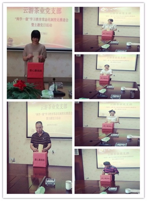 2017年7月19日,云游茶業(yè)黨支部召開“兩學(xué)一做”學(xué)習(xí)教育常態(tài)化制度化推進會及主題黨日活動,向災(zāi)區(qū)人民愛心募捐作為會議的一項重要議程進行。在公司董事長楊正武、黨支部書記楊應(yīng)輝的指導(dǎo)下,黨員們積極參與、慷慨解囊,共募集愛心款1萬元,全部轉(zhuǎn)賬給長沙市望城區(qū)雷鋒慈善會,用于災(zāi)區(qū)人民災(zāi)后重建工作。
