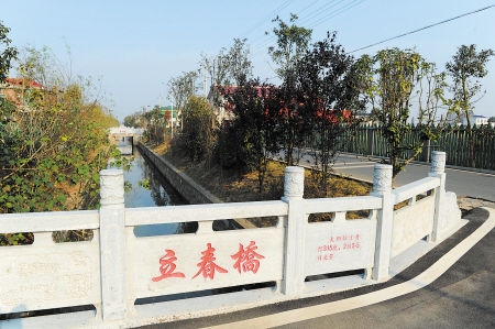 雖然事先在車上已經(jīng)知道了渠面架有24座橋,但好奇心重的讀者陸瑩瑩還是沿著渠邊一邊走一邊認真地數(shù),發(fā)現(xiàn)橋上刻有節(jié)氣歌,她還情不自禁為大家讀了起來?!傲⒋簶颍⒋簳r在六九頭,嫩刺荷苞現(xiàn)綠雛。春來水有三分熱,龍燈獅子舞千秋。”這24座由居民群眾自行組織建設的橋,以我國傳統(tǒng)的二十四節(jié)氣為主題,一次命名為“立春橋”、“雨水橋”、“驚蟄橋”等。每座橋均配有相應的節(jié)氣簡介、農(nóng)事歌、農(nóng)耕圖和節(jié)氣花。